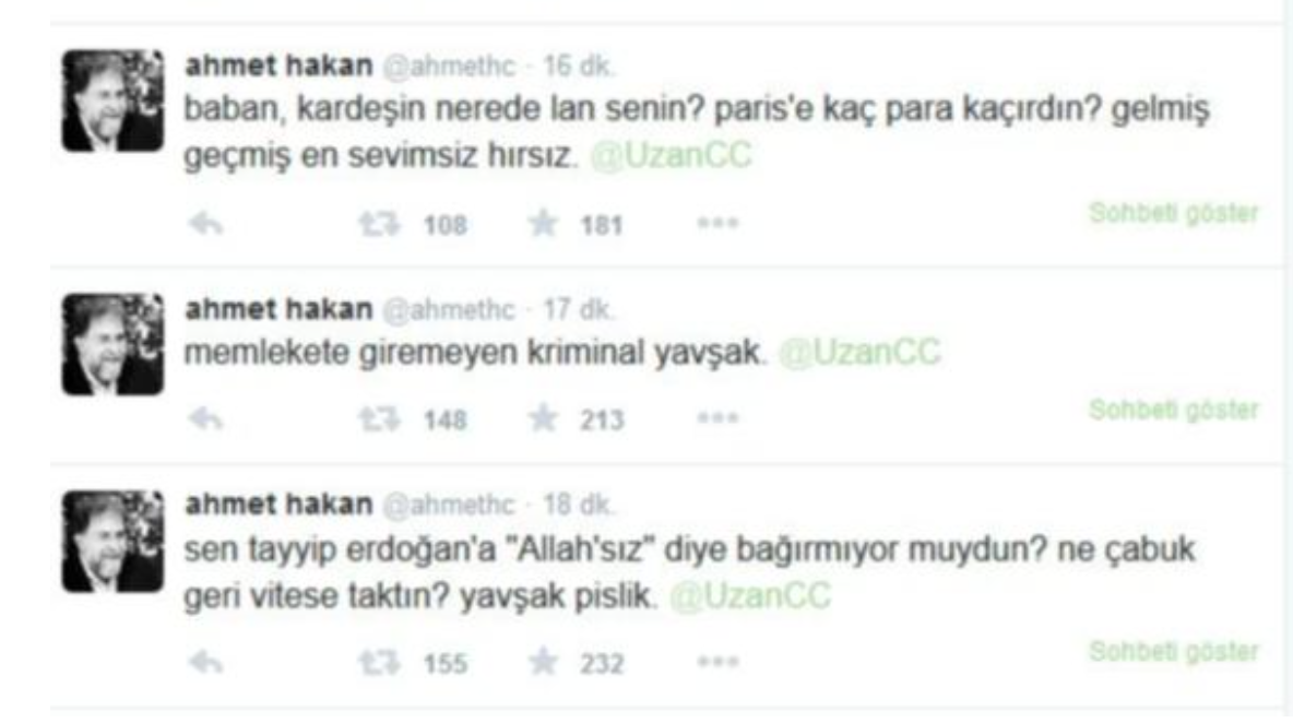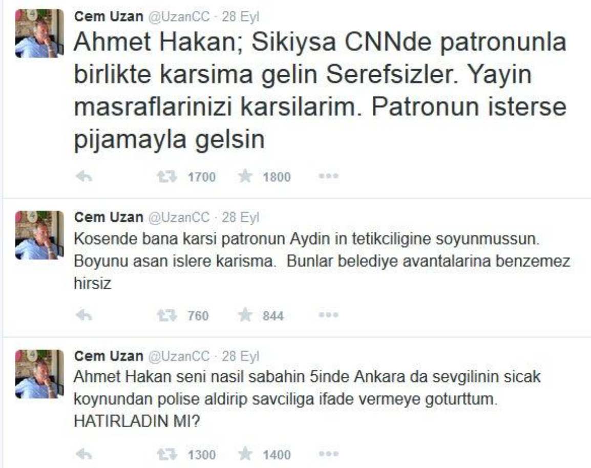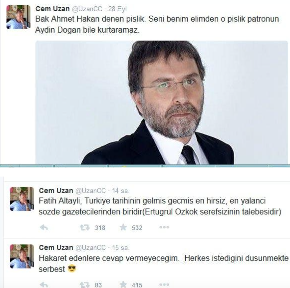 Cem Uzan, Twitter'da "Bak Ahmet Hakan denen pislik, seni benim elimden o pislik patronun Aydın Doğan bile kurtaramaz" diye yazarak alenen Ahmet Hakan'ı tehdit etmişti...