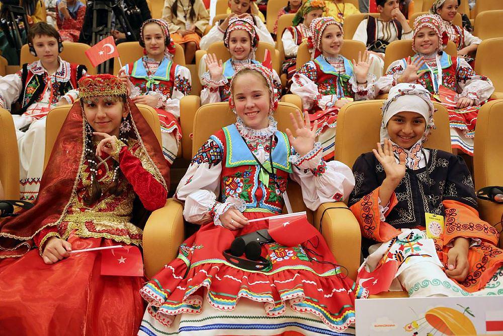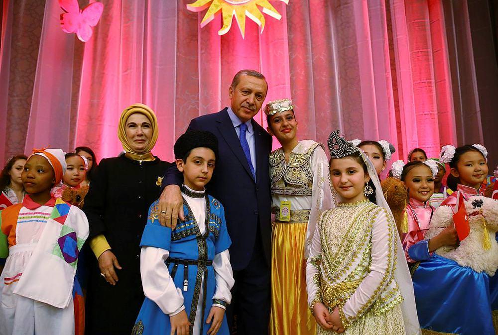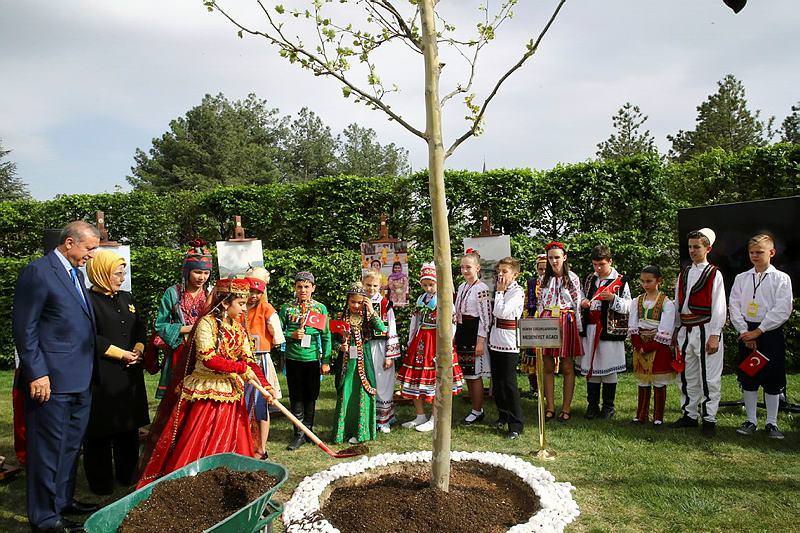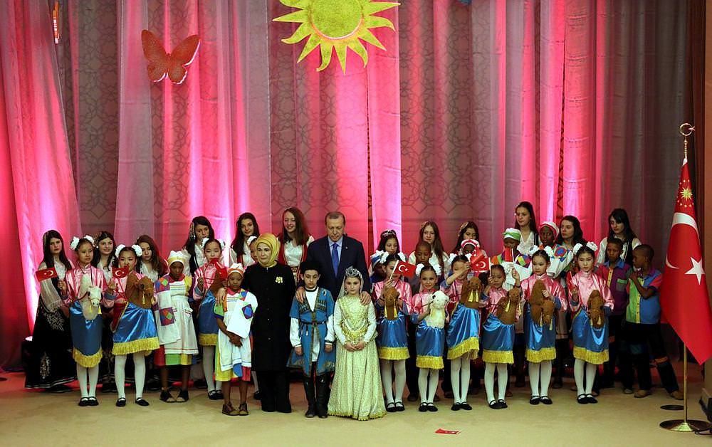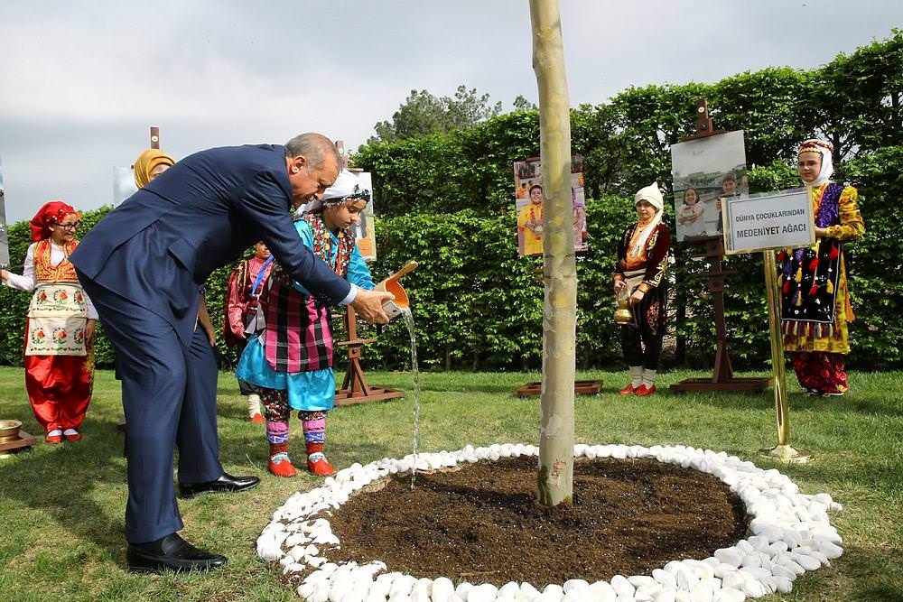 Cumhurbaşkanı Tayyip Erdoğan, 38. Uluslararası 23 Nisan Çocuk Şenliği için dünyanın 25 ülkesinden Türkiye'ye gelen 300'ü aşkın çocuğu Cumhurbaşkanlığı Külliyesi'nde ağırladı. Çocuklara seslenen Erdoğan, "Siz çocuklar hesapsız, riyasız, yalansız sevginin adısınız. 5 tane torunum var. Onları kucakladığımda ne hissediyorsam inanın bana her çocuk için aynısını hissediyorum" dedi. Öte yandan Cumhurbaşkanı Erdoğan, eşi Emine Erdoğan, Türk ve yabancı çocuklarla birlikte Külliye bahçesine 'Medeniyet çınarı' adı verilen bir çınar ağacı dikti. Erdoğan, daha sonra dünyanın 6 nehrinden getirilen sularla, çınar ağacına can suyu verdi. Can suyunun Nil, Dicle, Mississippi, Fuji, Ganj ve Tuna nehirlerinden getirildiği öğrenildi. Ayrıca çocukların kabulü için salon rengarenk süslendi. Sahnenin yan taraflarında ise Karagöz ve Hacivat modelleri yer aldı.