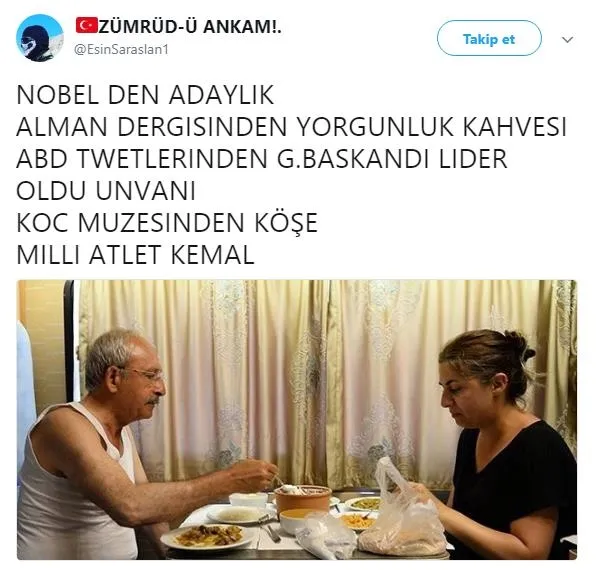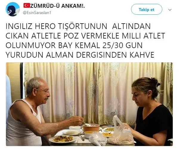 FETÖ ve PKK'lılarla kol kola Ankara'dan İstanbul'a yürüyen Kemal Kılıçdaroğlu'nun atletli fotoğrafı ortaya çıktı. Hürriyet gazetesinin foto muhabiri tarafından çekilen ve hiç bilinmeyen fotoğrafları basına servis edildi. Kılıçdaroğlu'nun fotoğrafı sosyal medyayı salladı, birbirinden komik yorumlar yapıldı. İşte o tweetlerden bazıları: