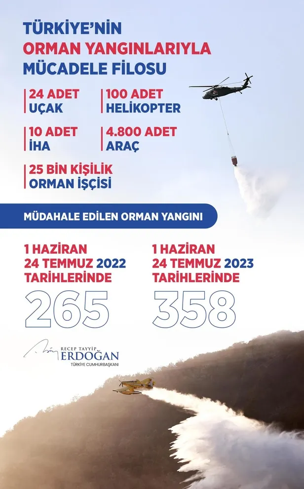 Önceki yıllarda yaşanan yangınların bir kısmının doğal sebeplerden, bir kısmının da terör ve ihmal gibi faktörlerden meydana geldiğini ifade eden Erdoğan, "Bu sene en kötü senaryoyu düşünerek, havada ve karada güçlü bir altyapı kurduk. Mevcut filomuzu, Rusya'dan gelen 2 büyük uçakla tahkim ettik. Rezerv güçlerle birlikte toplam 24 uçak, 100 helikopter ve 10 İHA'mızla orman yangınlarıyla mücadele ediyoruz. Ayrıca 4 bin 800 aracımız ve 25 bin orman işçimiz de karadan müdahale noktasında görev yapıyor." bilgisini verdi.
