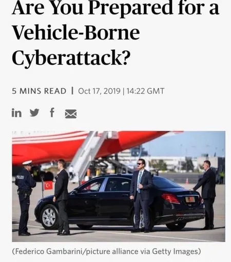 "Araç kaynaklı bir siber saldırı için hazır mısınız?" başlığıyla yayınlanan yazının görselinde dünyadaki binlerce liderin arasından Cumhurbaşkanı Erdoğan'ın makam arabasının seçilmesi dikkatlerden kaçmadı.