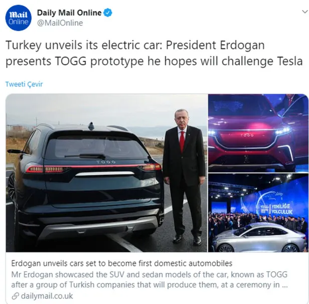 Daily Mail Türkiye'nin ilk yerli otomobili ile ilgili attığı başlıkta, "Türkiye elektrikli arabasını Cumhurbaşkanı Erdoğan, Tesla'ya meydan okumayı umduğu 300 mil menzilli TOGG prototipini tanıttı." ifadelerini kullandı.