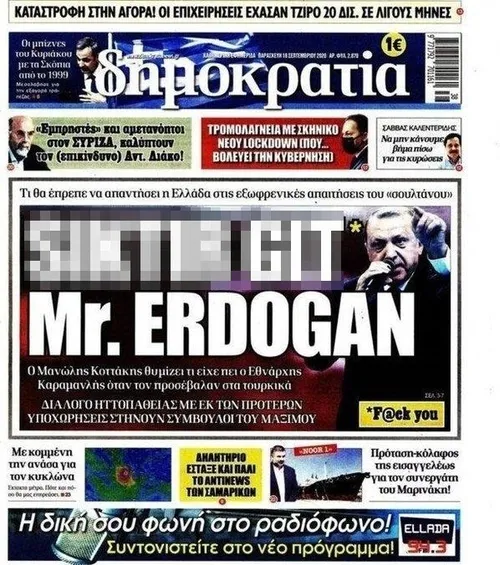 Türkiye ile Yunanistan arasında tansiyon yükselirken, Yunan medyasında küstah manşetler yer almaya başladı. Türkiye ile sahada bir türlü başa çıkamayan, masada da kaybetmemek için sürekli kaçan Yunanistan'da medya da raydan çıktı. Ülkede yayın yapan Dimokratia isimli gazete dün ahlaksız bir manşet ile okuyucularının karşısına çıkmıştı.