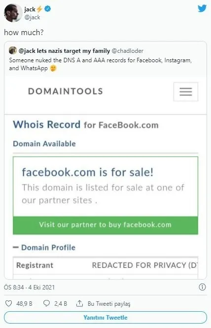 "Facebook domaini (bir Web sitesinin İnternet'teki adı ve adresi) satışa çıkarıldı" haberini alıntılayan Twitter kurucusu Jack Dorsey, alan adı için ne kadar ücret istendiğini sordu.