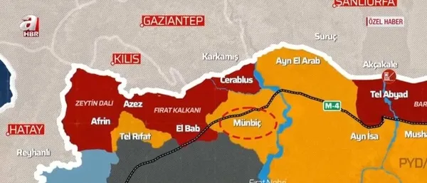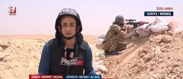 A Haber ekibi, Türk televizyonlarında bir ilke imza atarak Münbiç'teki terör örgütüPKK/YPG mevzilerini 200 metre mesafeden görüntüledi. Esad rejimi bayrağının dalgalandığı PKK/YPG mevzisinde keskin nişancılar da bulunuyor. Teröristler ekibimizin bulunduğu alana taciz ateşi de açtı.