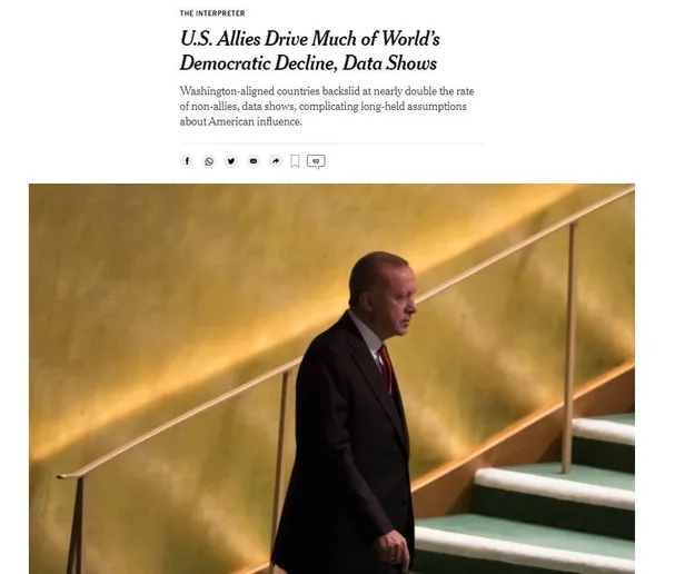 ABD'nin meşhur tetikçi New York Times gazetesi, "demokrasi" kavramı üzerinden algı kokan bir analize imza attı. Başkan Erdoğan'ın fotoğrafıyla yayınlanan gazetenin analizinde, ABD'nin müttefiklerinde "demokrasinin gerilediği" iddia edildi, Türkiye hedef alındı.