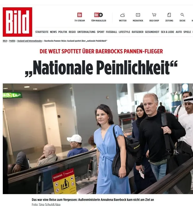 Almanya Dışişleri Bakanı Annalena Baerbock’un Avustralya, Yeni Zelanda ve Fiji'yi kapsayan gezisi uçak arızası sebebiyle iptal edildi. Bu skandal dünya gündeminde dalga konusu olurken Alman Bild gazetesi de meseleyi manşetine taşıdı. Gazete dünyanın Almanya ile dalga geçtiğini belirterek, "Ulusal utanç" başlığını attı.