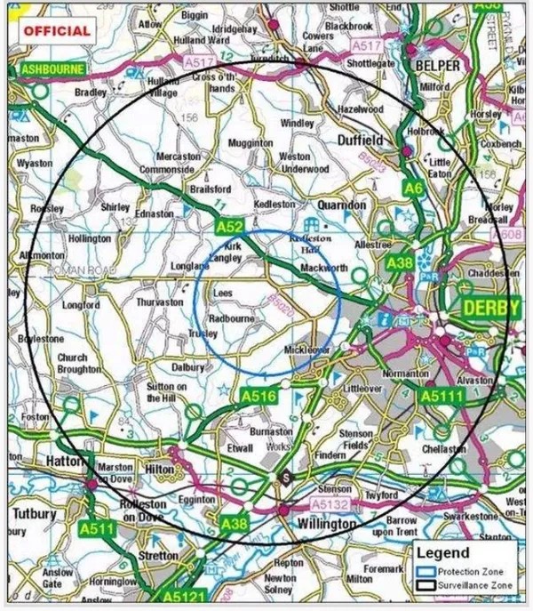 Çevre, Gıda ve Köy İşleri Bakanlığı tarafından yayınlanan belgelere göre, 3 kilometrelik koruma bölgesi Mackworth ve Mickleover'ın eteklerine kadar uzanıyor. Gözetim bölgesi ise, Derbyshire'ın büyük bölümlerinin yanı sıra Willington, Hilton ve Duffield'ı da içine alıyor.