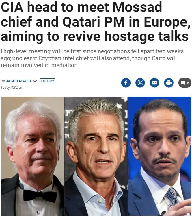 İsrail gazetesi The Times of Israel'a konuşan iki yetkili, CIA direktörü William Burns'ün önümüzdeki günlerde Hamas'ın elinde tuttuğu İsrailli rehinelerin serbest bırakılmasına yönelik müzakereleri canlandırmak amacıyla Mossad şefi David Barnea ve Katar Başbakanı Muhammed bin Abdulrahman Al Thani ile görüşmek üzere Avrupa'ya gideceğini iddia etti.