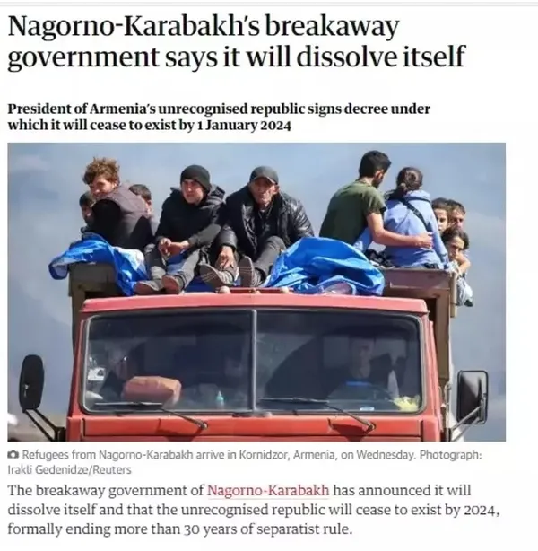 İngiliz Guardian gazetesi ise ayrılıkçı rejimin 30 yılı aşkın süre sonra kendisini feshedeceğini açıkladığını belirtti ve etnik Ermenilerin çoğunun bölgeyi terk etmesinin beklediğini yazdı.