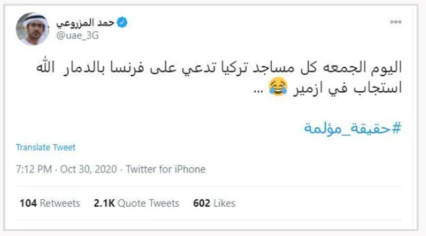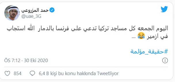 BAE Veliaht Prensi Zayed'in 'paralı' gazetecisi Hamad Al Mazrouei alçak paylaşımlarına devam ediyor. Al Mazrouei, İzmir'deki depremin ardından, ''Bugün Cuma, Türkiye'nin bütün camileri Fransa'yı yıktığını iddia ediyor. Allah İzmir'den cevap verdi.'' paylaşımını yaptı. Bu paylaşıma binlerce kişi tepki gösterdi.