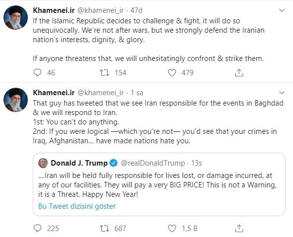 Trump'a cevap ise İran dini lider Ali Ayetullah Hamaney'den geldi. ABD Başkanının tweet'ini alıntılayarak son dakika bir mesaj paylaşan Hamaney, "Bu adam Bağdat'taki olaylar yüzünden İran'ı sorumlu olarak görüyoruz diye tweet attı ve İran'a yanıt vereceğiz dedi Birincisi: Hiçbir şey yapamazsın... İkincisi: Eğer mantıklı olsaydınız -ki değilsiniz- Afganistan, Irak ve diğer ülkelerde işlediğiniz suçlardan dolayı milletlerin sizden nefret ettiğini anlardınız" dedi.