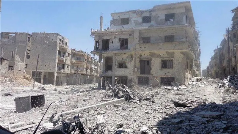 SNHR'nin raporuna göre, rejim güçlerinin havadan ve karadan düzenlediği saldırılar ve bombalamalarda El-Asida, Es Sehhane, El-Kilayniyye, Ez Zenbak, El-Hayriyya ve El Başuriyye gibi semtler yoğun şekilde hedef alınırken kent merkezinin yaklaşık üçte biri yerle bir oldu.