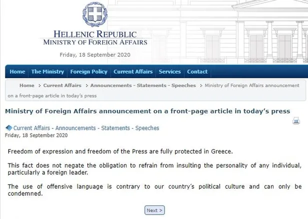 Yunanistan'da "ifade ve basın özgürlüğü koruma altındadır" sözlerine yer verilen açıklamada, Başkan Erdoğan'ı hedef alan çirkin manşet için "Saldırgan dil kullanımı ülkemizin siyasi kültürüne aykırıdır ve ancak kınanabilir." denilmekle yetinildi.