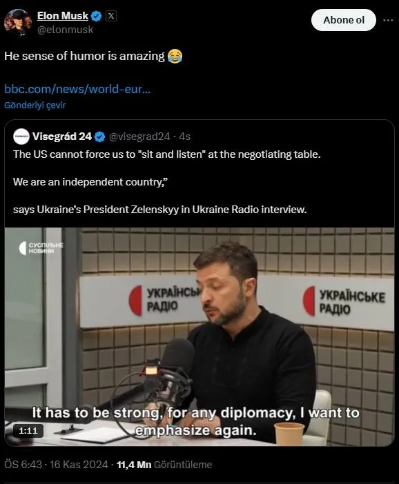 Elon Musk ise, sosyal medya üzerinden yaptığı paylaşımla Ukrayna Devlet Başkanı Volodimir Zelenski'nin sözlerini alaya aldı. Musk, Zelenski'nin açıklamalarını "Onun espri anlayışı harika" şeklinde yorumladı. Paylaşımında ayrıca 2021 yılında BBC'de yayınlanan bir haberi de ekledi. Haberde, "Üç yıl önce seçildiğinde siyasetle hiçbir deneyimi olmayan komedyen Ukrayna Devlet Başkanı Volodimir Zelenski, bir anda ikna edici bir savaş lideri olarak ortaya çıktı" ifadeleri yer alıyordu. Musk'ın bu paylaşımına, Zelenski'yi tiye aldığı yönünde yorumlar yapıldı.