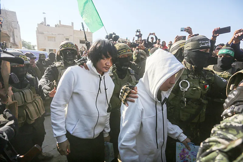 Yehud ve Moses ile 5 Tayland vatandaşından oluşan 7 esir ise Han Yunus kentinde Hamas'ın Gazze'deki öldürülen lideri Yahya Sinvar'ın evinin bulunduğu bölgede yoğun kalabalık eşliğinde Kızılhaç ekiplerine teslim edildi.