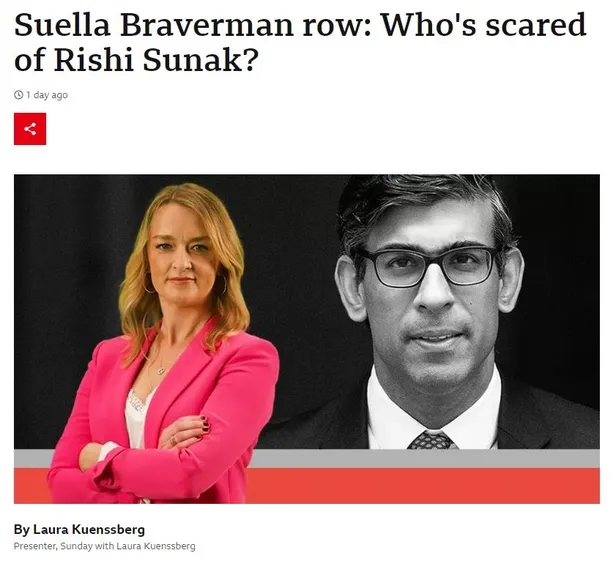 Rishi Sunak'ın siyasi bir tehlikeyle karşı karşıya olduğuna dikkat çeken Kuenssberg, Braversman görevden alınmadığı sürece 10 Numara'nın otorite kuramayacağına dikkat çekmişti. Rishi Sunak'ın Braverman'ı görevden almak için Londra'daki eylemlerin sona ermesini beklediğini öne süren Kuenssberg, tartışmalı bakanın pazartesi günü görevden alınacağını iddia ediyordu.