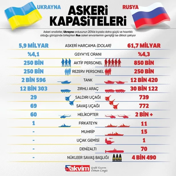 Ukrayna Genelkurmay Başkanlığı, Rus güçlerine ait 14 savaş uçağı, 8 helikopter, 102 tank ve 536 zırhlı aracın vurulduğunu, Ukrayna Devlet Başkanlığı Ofisi Başkan Yardımcısı Mihayil Podolyak da 3 bin 500'den fazla Rus askerin etkisiz hale getirildiğini bildirdi.