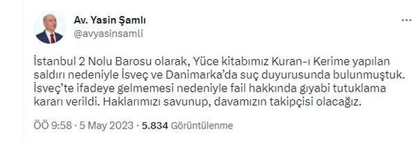 İstanbul 2 No'lu Barosu Başkanı Yasin Şamlı, yaptığı açıklamada, "Kutsal kitabımız Kur'an-ı Kerim'e ve bayrağımıza yapılan saldırı suçunun failinin hukuk önünde hesap vermesi ve işlediği suçun cezasını alması için bugün İsveç'in başkenti Stockholm'deyiz. Biraz önce suç duyurusunda bulunduk." ifadesini kullanmıştı.