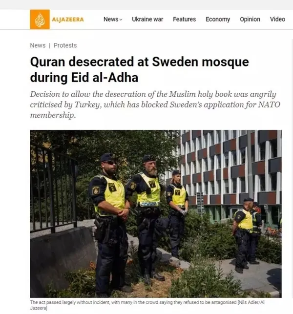 Skandalla ilgili gelişmeyi manşetten okuyucularına sunan Al Jazeraa, 'Müslümanların kutsal kitabına yapılan saygısızlığa izin verme kararı, İsveç'in NATO üyelik başvurusunu engelleyen Türkiye tarafından öfkeyle eleştirildi' ifadesini kullandı.