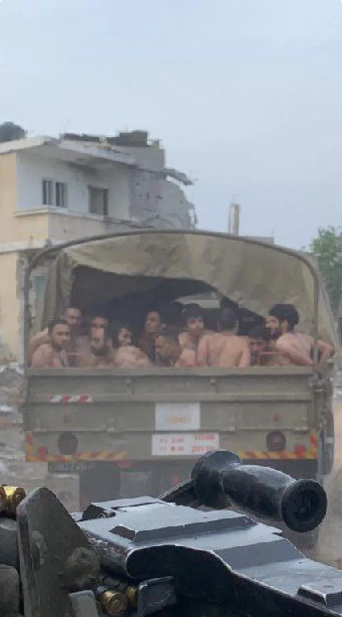 Son dakika haberleri... Gazze'de 17 bini aşkın kişiyi katleden katil İsrail'in zulmünü gözler önüne seren bir yeni görüntü daha geldi. Tel Aviv'in katil ordusu, Gazze'de onlarca sivil erkeği soyup ellerini ve gözlerini bağladı. Çıplak halde kamyonlara bindirilen Filistinlilerin nereye götürüldüğü ise henüz bilinmiyor. Öte yandan İsrail basını, görüntülerin teslim olan "Hamas şüphelilerini" gösterdiğini iddia etti. Hamas'tan yapılan açıklamada ise grup üyelerinin toplu olarak tutuklandığına dair haberler yalanlandı. Cenevre merkezli Avrupa-Akdeniz İnsan Hakları İzleme örgütü, gözaltına alınan erkekler arasında doktorlar, akademisyenler, gazeteciler ve yaşlıların olduğunu açıkladı.