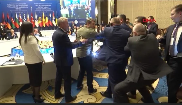 Ukrayna heyetinin Rus heyetine yönelik bayraklı protesto girişimine müdahale etti.