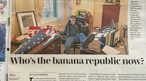 Yıllarca bombalarla dünyanın dört bir yanında "demokrasi" adı altında ölüm götüren ABD, ilk kez "demokrasi" ilacını kendi tattı. Kenya Daily Nation gazetesi ABD'de yaşanan tarihi olayları “Muz cumhuriyeti kim şimdi?” başlıklı bir haberle verdi. Gazetede çıkan haberde ABD Temsilciler Meclisi Başkanı Nancy Pelosi'nin ofisini basan Richard Bigo Barnett'in fotoğrafına yer verildi.