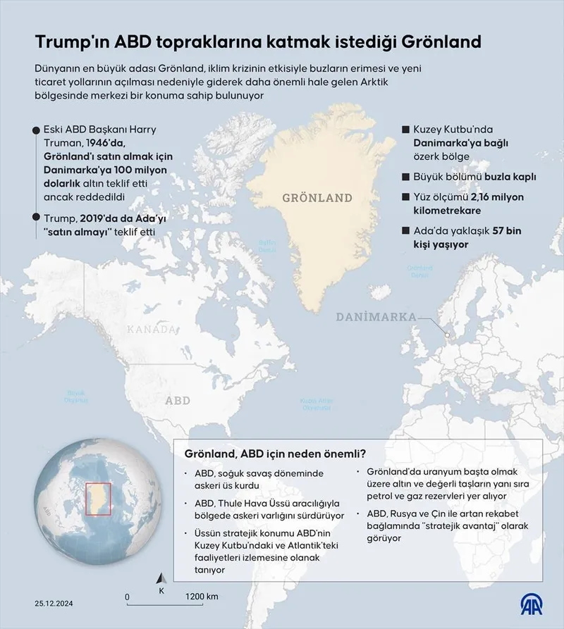 Trump, pazartesi günü yaptığı açıklamada devasa adanın mülkiyeti ve kontrolünün ABD için ʺkesin bir zorunlulukʺ olduğunu söyledi. Trump, Truth Social hesabından yaptığı paylaşımda ʺDünya çapında Ulusal Güvenlik ve Özgürlük amaçları doğrultusunda, Amerika Birleşik Devletleri, Grönland'ın mülkiyetinin ve kontrolünün mutlak bir gereklilik olduğunu düşünmektedir.ʺ ifadelerine yer verdi., Reuters