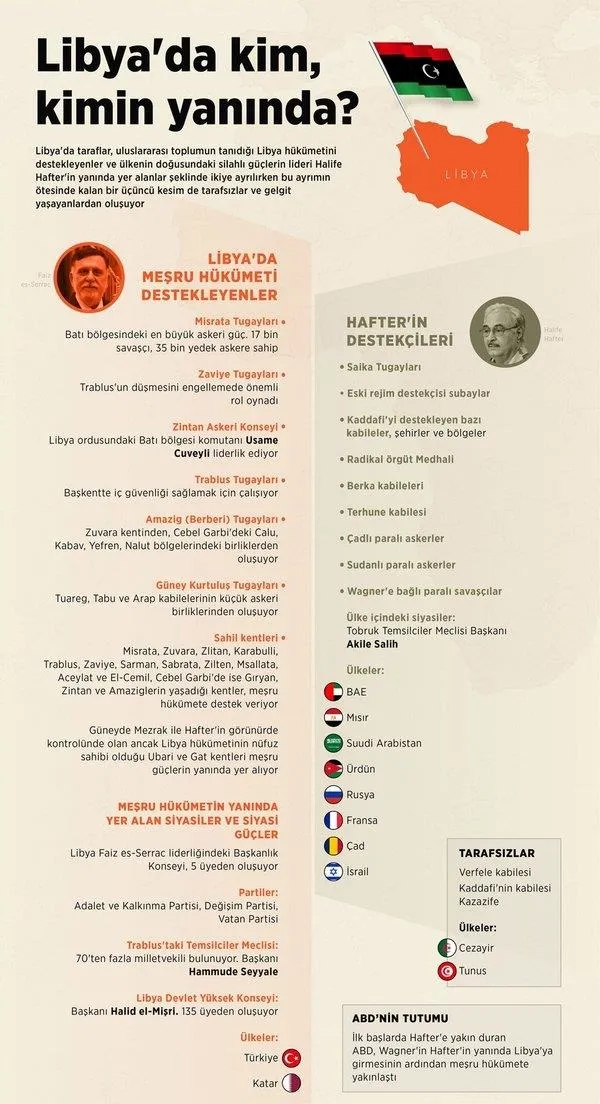 Libya'da taraflar, uluslararası toplumun tanıdığı Libya hükümetini destekleyenler ve ülkenin doğusundaki silahlı güçlerin lideri darbeci Hafter'in yanında yer alanlar şeklinde ikiye ayrılırken bu ayrımın ötesinde kalan bir üçüncü kesim de tarafsızlar ve gelgit yaşayanlardan oluşuyor.