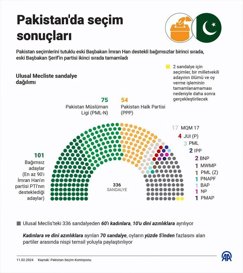 Pakistan'da Ulusal Meclis ve eyalet meclisleri için 8 Şubat'ta düzenlenen seçimleri, eski Başbakan İmran Han'ın partisi Pakistan Adalet Hareketi (PTI) destekli bağımsız milletvekilleri birinci, eski Başbakan Navaz Şerif'in liderliğini yaptığı Pakistan Müslüman Ligi-Navaz (PML-N) ise ikinci sırada tamamladı.
