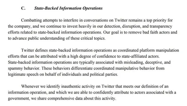 Twitter, hükümet destekli manipülasyonları tespit etmek ve engellemek için çaba sarf ettiğini söylüyordu. Hatta Kongre'ye devlet destekli tüm gizli operasyonları ve aldatıcı yayınları hızla tespit etme ve kapatma taahhüdü verdi.
