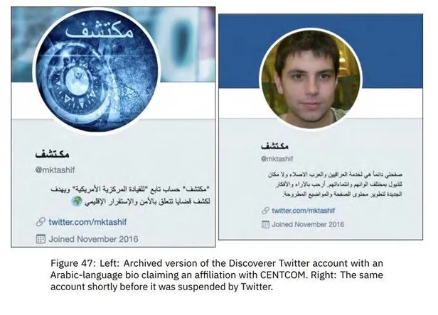 Stanford raporu, tüm hesapları ifşa etmedi. Fakat CENTCOM'un "beyaz liste" ayrıcalıkları istediği Twitter hesabının adını verdi. Hesap, yapay zeka tarafından oluşturulan sahte görsel kullanmış.