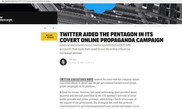 Twitter yöneticilerinin yıllarca şirketin platformunda hükümet destekli gizli propaganda kampanyalarını tespit etmek ve engellemek için çaba sarf ettiğini iddia ettiğini ancak perde arkasında, şirketin ABD ordusunun talebi üzerine bazı psikolojik harekat hesaplarını beyaz listeye alarak dahili koruma sağladığını yazan Fang, CENTCOM'un, Yemen, Suriye, Irak, Kuveyt ve Orta Doğu'nun genelinde insanların fikirlerini şekillendirmek için üretilen içerikleri yaymak için Twitter'ın korumaya aldığı bu hesapları kullandığını kaydetti.