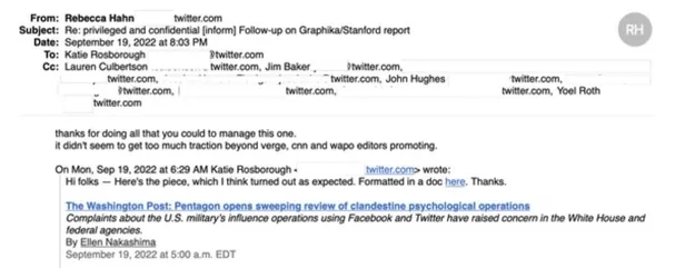 Pentagon'un bu geniş faaliyetinden Twitter'ın üst yönetiminin de haberdar olduğunu belirten Fang, Twitter'dan Lisa Roman adlı bir yetkilinin bir Pentagon yetkilisine gönderdiği e-maili paylaştı.