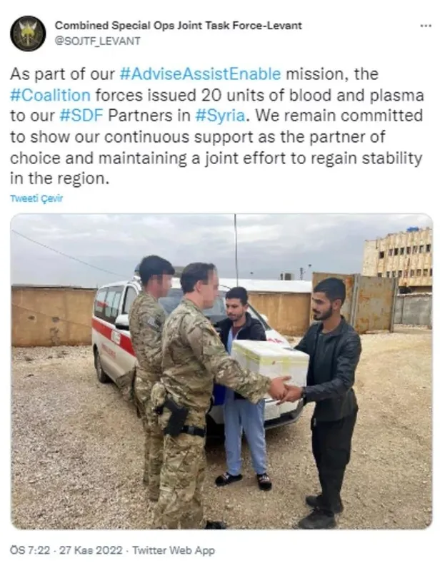 Merkez Kuvvetler Komutanlığı (CENTCOM)'dan skandal bir paylaşım geldi. CENTCOM'un Twitter hesabı, Suriye'deki koalisyon güçlerinin SDF'li (PKK'nın bir başka kolu) ortaklarına 20 ünite kan ve plazma bağışladığını duyurdu.