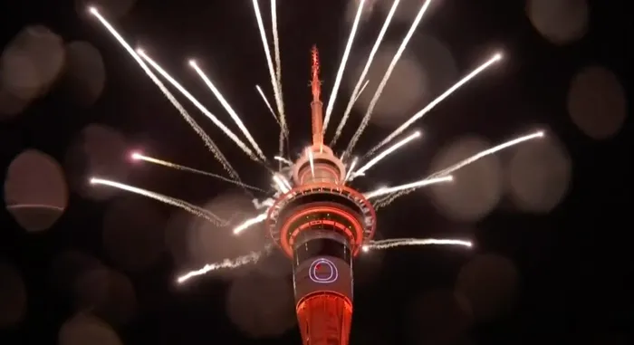 Auckland şehrinin en yüksek binası Sky Tower'da havai fişek gösterisi düzenlendi. Gökyüzünde havai fişekler patlarken, kulenin üst kısmı farklı renklere büründü.
