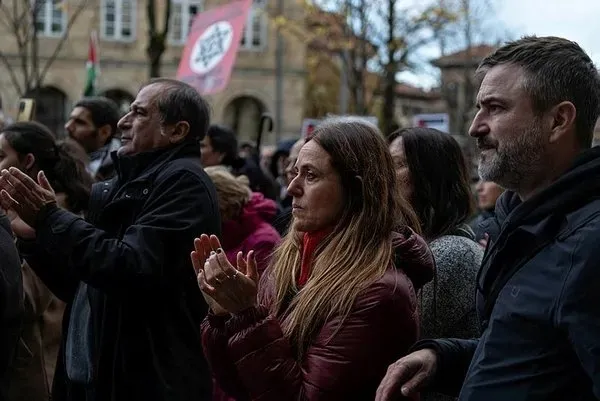 İspanya'nın kuzeyindeki Bask bölgesinde bulunan Guernica kasabasında düzenlenen etkinlikte yüzlerce kişi, insan zinciriyle mozaik oluşturarak İsrail'in Gazze'deki saldırılarında hayatlarını kaybedenlerin acılarını ve Filistin bayrağını resmetti.