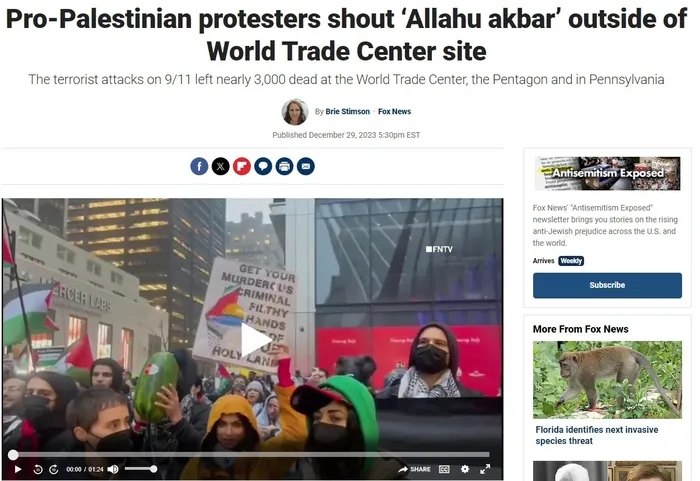 Brie Stimson imzalı haberde "Filistin yanlısı protestocular Dünya Ticaret Merkezi binası önünde 'Allahu Ekber' diye bağırıyor" başlığını kullanan FoxNews, haberde "Perşembe günlü protesto İslamcı teröristlerin 22 yıl önce Dünya Ticaret Merkezi, Pentagon, Shanksville, Pensilvanya'ya yönelik 11 Eylül saldırılarında yaklaşık 3 bin kişiyi öldürdüğü yerde gerçekleşti" ifadelerini kullandı.