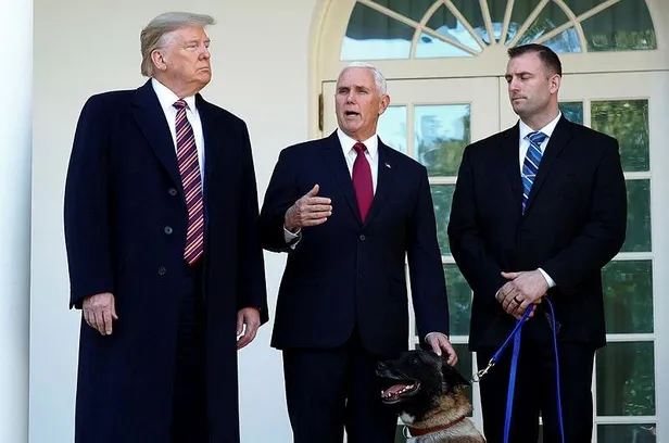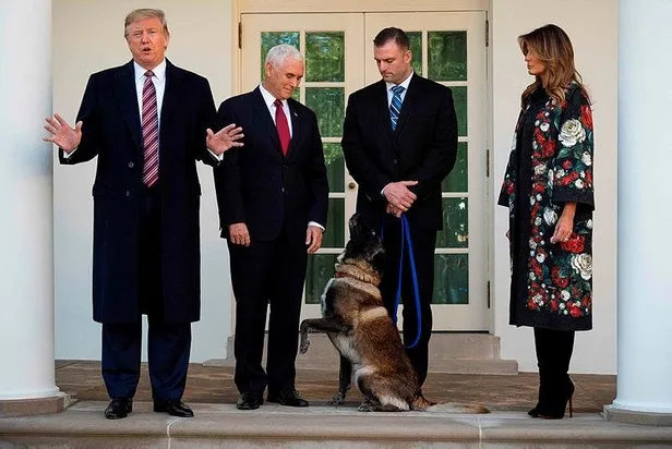 ABD Başkanı Donald Trump, eşi Melania Trump, Başkan Yardımcısı Mike Pence ve Bağdadi operasyonunda kullanılan Conan ile Beyaz Saray'ın bahçesinde kameraların karşısına çıktı.