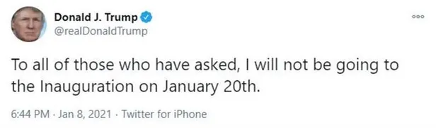 An itibarıyla hiçbir platformda paylaşım yapma şansı kalmayan Donald Trump ise yaptığı son paylaşımda 'Şimdi neden Jo Biden'ın başkanlık törenine gitmeyeceğimi anladınız mı?' diyerek konuya dair son sözünü söylemiş oldu.
