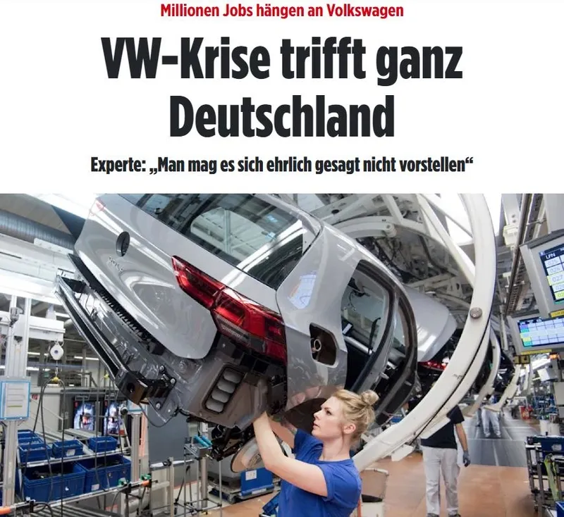 Otomobil devi Volkswagen’ın Almanya’daki fabrikaları kapatacağını duyurması ülkede şok etkisi yarattı. Uzmanlar Volkswagen’daki krizin tüm sektörleri etkileyeceğini belirtirken Bild gazetesi ise “Milyonlarca iş Volkswagen’a bağlı! VW krizi tüm Almanya’yı vurdu” dedi ve Almanya’nın ekonomik çöküşe sürüklendiğine dikkat çekti.