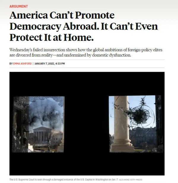 Dünya çapında büyük yankı uyandıran kongre işgali sonrası, ABD merkezli Foreign Policy dergisinde, "Amerika yurt dışında demokrasiyi teşvik edemez. İçeride bile koruyamaz" başlıklı bir yazı kaleme alındı.