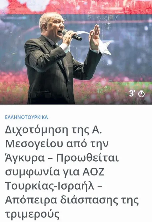 Sitedeki yazıda, "Tel Aviv, Ankara ile işbirliği yaparsa Türkiye İsrail yakınlaşabilir. Bu sorun 2010'dan beri bir Türk amiral tarafından analiz edildi ve önerildi. Ankara Doğu Akdeniz'in ikiye bölünmesini istiyor, Türkiye-İsrail münhasır ekonomik bölge anlaşması önererek üçlü ekseni zayıflatmaya çalışıyor. Doğu Akdeniz'de Yunanistan ve Kıbrısın haklarını azaltmaya çalışan Türkiye, her aşamada yeni Osmanlıcılık planlarını da ilerletiyor. Yunanistan'ın müttefiki İsrail'le imzaladığı Eastmed projesinden sonra Erdoğan, Libya modelini tekrar hayata geçirmeye çalışıyor. Bu kapsamda Doğu Akdeniz'i ikiye bölerek, enerji kaynaklarını paylaşma konusunda sunduğu teklifle bölgede kendi hayallerine engel olacak ülkeleri yanına çekmeye çalışıyor" denildi.