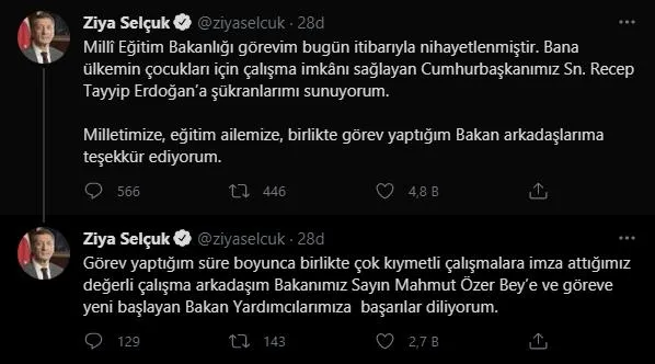 Eski Bakan Ziya Selçuk sosyal medyadan yaptığı açıklamada, "Millî Eğitim Bakanlığı görevim bugün itibarıyla nihayetlenmiştir. Bana ülkemin çocukları için çalışma imkânı sağlayan Cumhurbaşkanımız Sn. Recep Tayyip Erdoğan'a şükranlarımı sunuyorum. Milletimize, eğitim ailemize, birlikte görev yaptığım Bakan arkadaşlarıma teşekkür ediyorum.