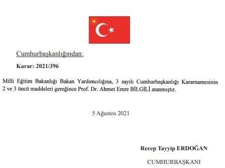 Milli Eğitim Bakan Yardımcılığına ise Prof. Dr. Ahmet Emre Bilgili, Prof. Dr. Petek Aşkar ve Dr. Sadri Şensoy atandı.