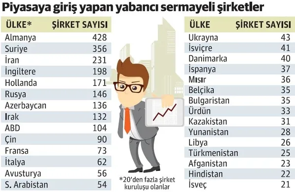 Dünya gazetesinin haberine göre, Türkiye piyasasında geleneksel olarak etkin olan ülkeler İngiltere, Hollanda, Fransa, ABD sermayeli şirketler yine ilk 10'da yer alıyorlar. Rusya sermayeli 146 şirket kurulmuş veya piyasaya girmiş. Bu ülke sermayeli şirket sayısı 2 binin üstünde. "Uçak krizi" döneminde hız kesen girişler, yeniden artmış gözüküyor. Azerbaycan sermayesi son dönemde Türkiye'ye giriş yapıyor. 2017'nin son 6 ayında da Azerbaycan sermayeli 136 şirket kurulmuş. Irak sermayeli 132 kuruluş var. Arap ülkelerinden en yüksek giriş Suudi Arabistan, Ürdün ve BAE'den. Suudi sermayeli 54 şirket kurulmuş. Ürdün sermayeli 33, BAE sermayeli kuruluş 17. Türk cumhuriyetlerinden, Azerbaycan dışında Kazakistan ve Türkmenistan'dan kayda değer giriş var. Kazak sermayeli 31, Türkmenistan sermayeli 25 şirket kurulmuş. Hindistan sermayeli 22 şirket kuruluşu dikkat çekiyor.