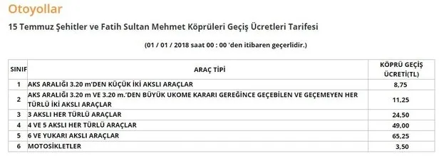 Motosiklet sürücüleri güncel tarifeye göre 15 Temmuz Şehitler ve Fatih Sultan Mehmet Köprüleri geçişleri için 3,50 lira ücret ödüyordu..