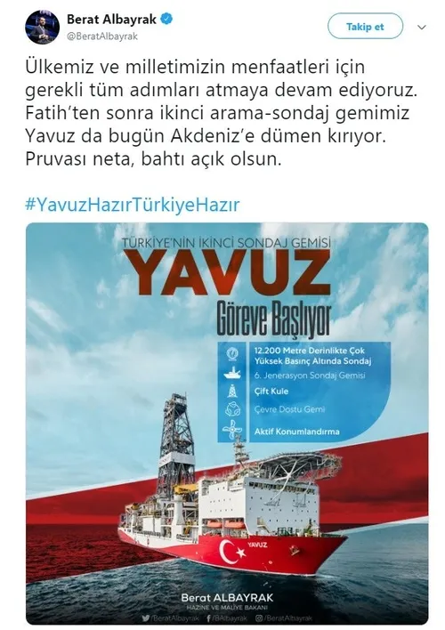 Berat Albayrak resmi Twitter hesabından yaptığı açıklamada, "Ülkemiz ve milletimizin menfaatleri için gerekli tüm adımları atmaya devam ediyoruz. Fatih'ten sonra ikinci arama-sondaj gemimiz Yavuz da bugün Akdeniz'e dümen kırıyor. Pruvası neta, bahtı açık olsun." ifadelerine yer verdi.