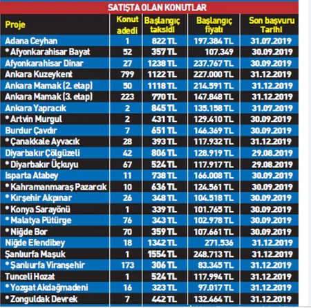 Açık satışta bulunan konutların başlangıç fiyatı 83 bin 345 lira ile 271 bin 536 lira arasında değişiyor. Ödeme seçenekleri ise 15 yıla hatta 20 yıla kadar uzanıyor. Satıştaki konutlar için peşinat oranları, projeye göre yüzde 10, 12, 15, 20, 25 olarak değişiklik gösteriyor. Ödenen peşinata göre vade de uzayabiliyor. Vade süreleri de projeye göre 96, 108, 120, 180, 216 ve 240 ay oluyor.