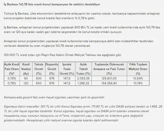 Normal konut kredisi paketinde yüzde 1.10 faiz oranı ile konut kredisi veren İş Bankası anlaşmalı konut projeleri üzerinden ev sahibi olmak isteyen müşterileri için ise yüzde 0.78 faiz oranı ile konut kredisi veriyor. Banka bu sayede 0.79 faiz oranı ile kredi veren kamu bankalarını geçmiş oldu. Sıfır konut almak isteyen kişiler için şu anda en uygun konut kredisi faiz oranı olarak anlaşmalı konut projelerinde 0.78 oranı ile İş Bankası tarafından uygulanıyor.